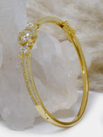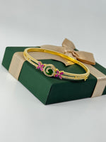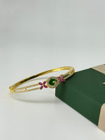 This stunning 18K gold plated bracelet, crafted in pure 925 silver, features a graceful dual-line design adorned with floral motifs set with sparkling white and ruby stones. Radiating timeless charm and festive beauty, it's a perfect statement piece for weddings, celebrations, or refined everyday elegance.