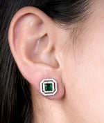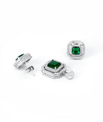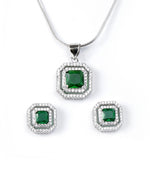 Make a bold yet elegant statement with this stunning pendant set, featuring a rich emerald green center stone framed by intricate silver detailing. The double-layered halo setting enhances its brilliance, adding a luxurious touch to any ensemble.