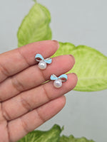 925 Sterling Silver Bow Pearl Earrings for Women | Minimalist Blue Enamel Studs | Rajasi Silver