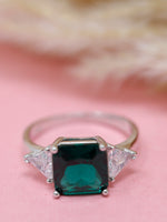 Make a bold statement with this 925 Sterling Silver Emerald Cut Green Gemstone Ring, designed for women who love sophistication and style. The centerpiece features a stunning emerald-cut green stone, flanked by two sparkling triangle-cut cubic zirconia stones for added brilliance.