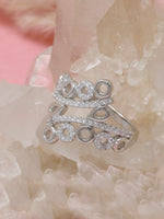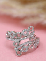 Turn heads with this dazzling 925 sterling silver rhodium-plated cocktail ring, designed with an artistic mix of open circle and teardrop motifs. Each curve is accented with brilliant cubic zirconia stones, creating a bold yet graceful sparkle.